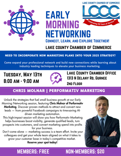 Unlock the strategies that fuel small business growth at our Early Morning Networking session, featuring Chris Molnar of Performativ Marketing. Discover proven methods to attract and convert new leads — from powerful Facebook campaigns to time-saving AI-driven marketing automation.